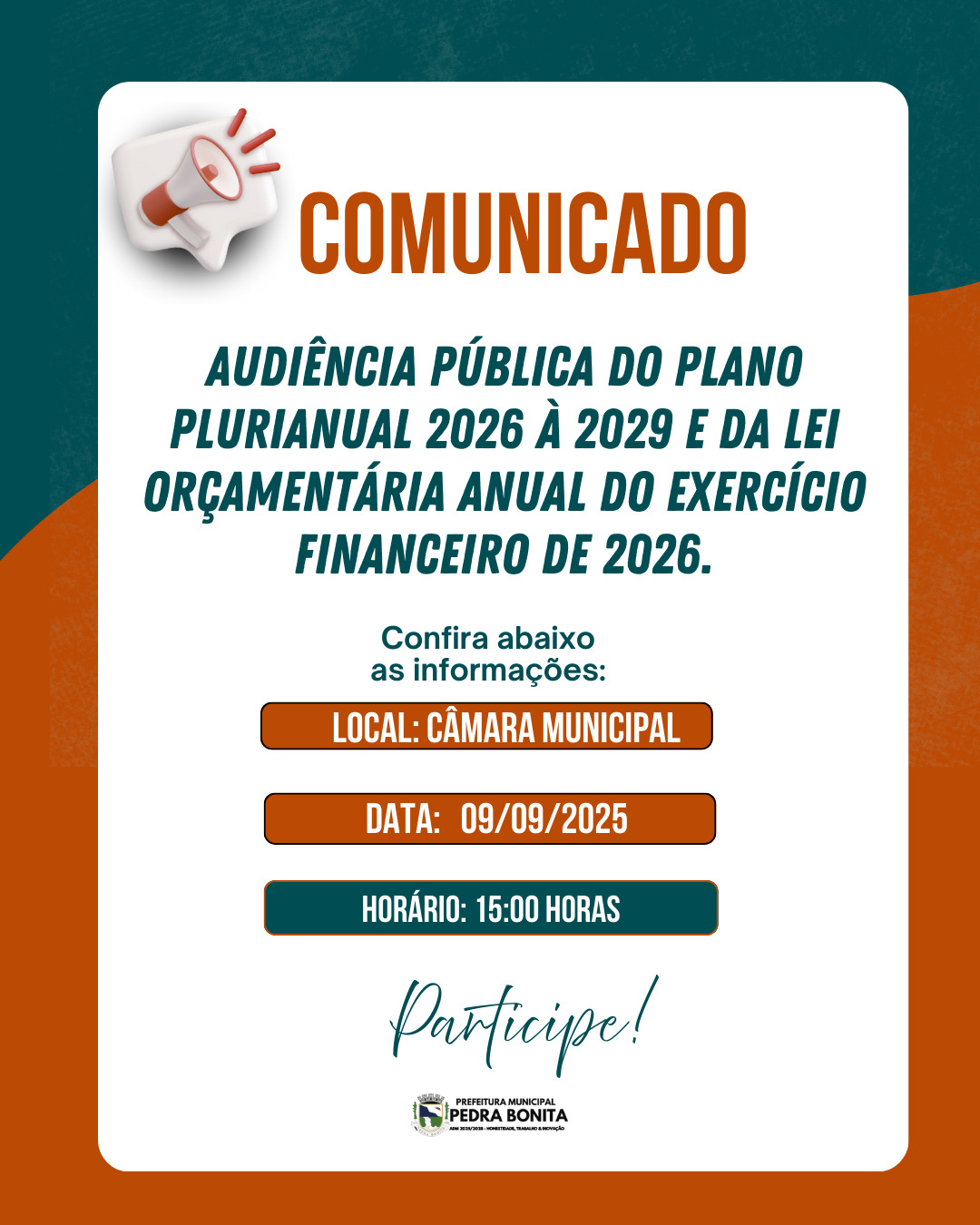 📢 COMUNICADO IMPORTANTE A Prefeitura Municipal de Pedra Bonita convida toda a população para participar da Audiência Pública do Plano Plurianual 2026 à 2029 e da Lei Orçamentária Anual do exercício financeiro de 2026. 🗓 Data: 09 de setembro de 2025 📍 Local: Câmara Municipal ⏰ Horário: 15h00 Sua presença é fundamental para a construção […]